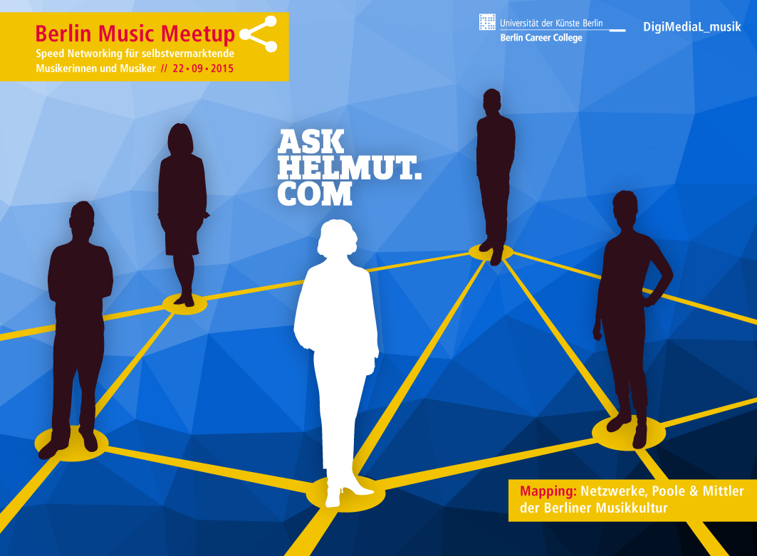 ASK HELMUT ist einer unserer Partner beim Berlin Music Meetup am 22.09.2015. Zentrale Idee ist es, an einem Abend eine Plattform zu schaffen zur effektiven Vernetzung von professionellen Musikschaffenden verschiedenster Genres, Musikverbänden und Musikervereinen, Entscheidungsträgern aus Politik, Kultur und Medien sowie Machern und Akteur_innen der Berliner Musikwirtschaft.